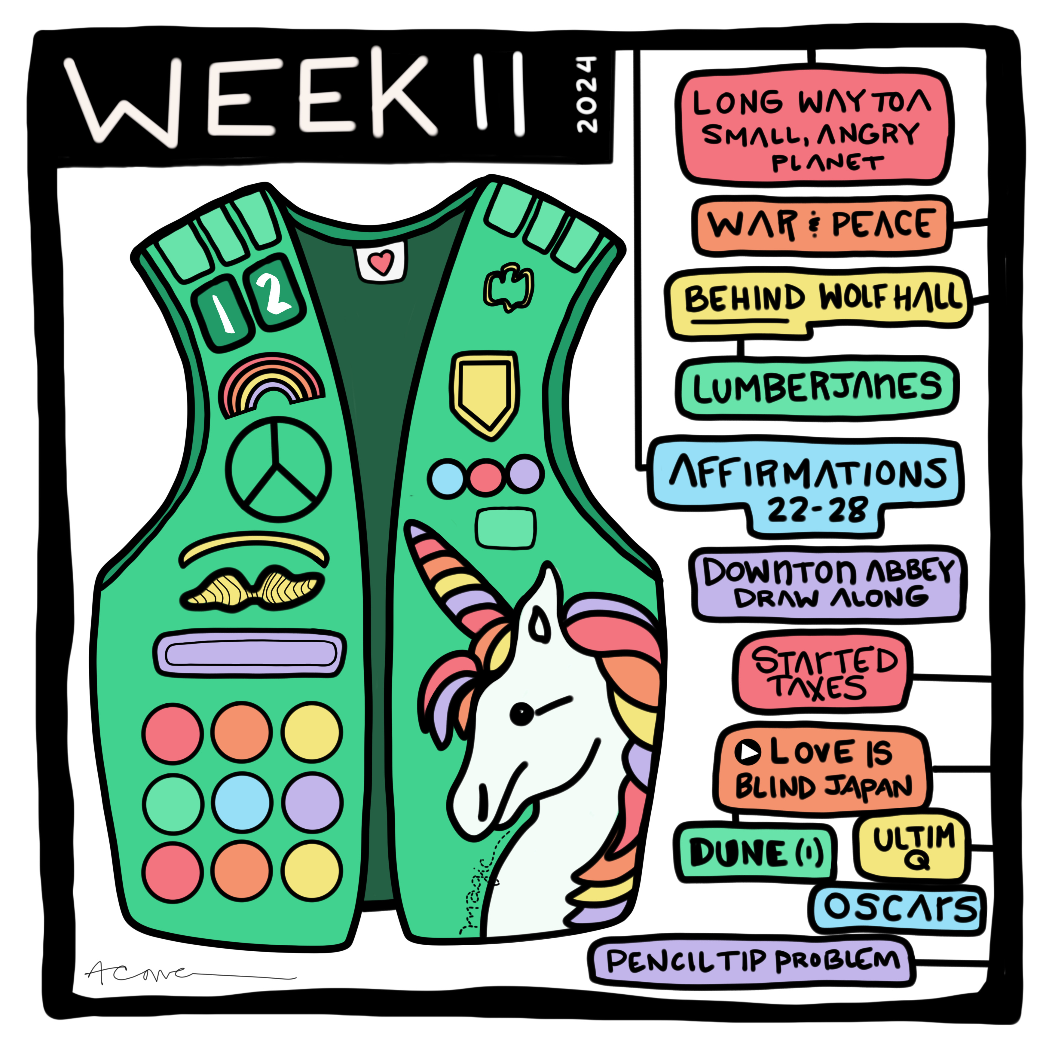 The weekly diary list comic image above is obviously connected this week. A generic scout vest covered in patches made sense, but it took an unexpected turn. I finished putting all the patches on. It was done, but then the unicorn appeared. It had to be there. Somehow it explains a lot. It breaks the mold of the vest. It insists on something different, magical, less quantifiable. It is outside the rules. I can’t start a fire with sticks. I don’t camp. I am more and more hesitant to leave my house. I have never pitched a tent.