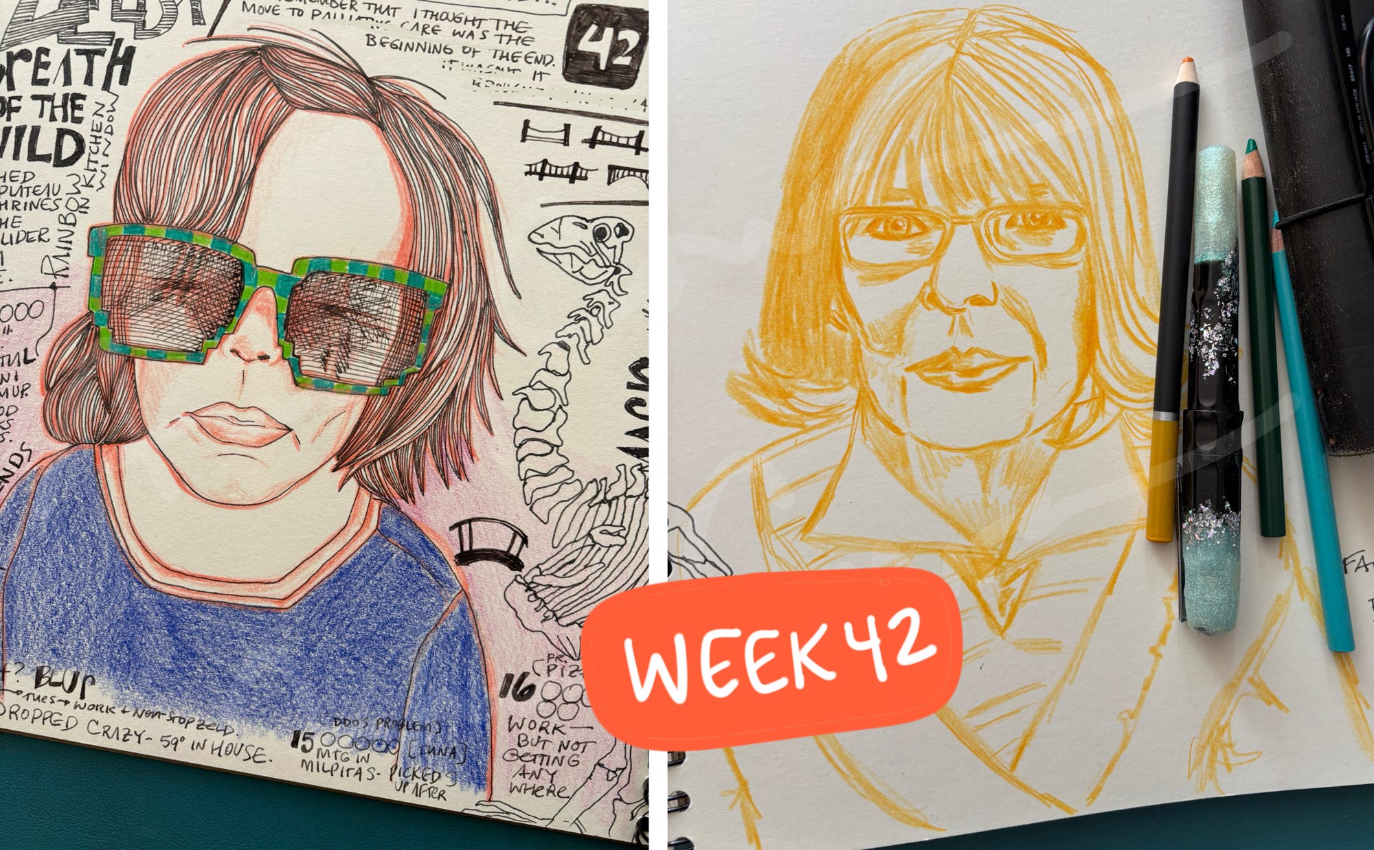 This morning, after I drew a pumpkin-head person to kick off Week 43 in my illustrated journal with my group, I delayed sitting down to finalize this post. I had decided I wouldn’t send this one by email. That decision made it so that it didn’t seem pressing to deal with a final edit (or what turned into adding sections like this and the stream-of-consciousness recounting, a glimpse into the way real overwhelm is manifesting in a fracturing of focus and inconsequential scatter).