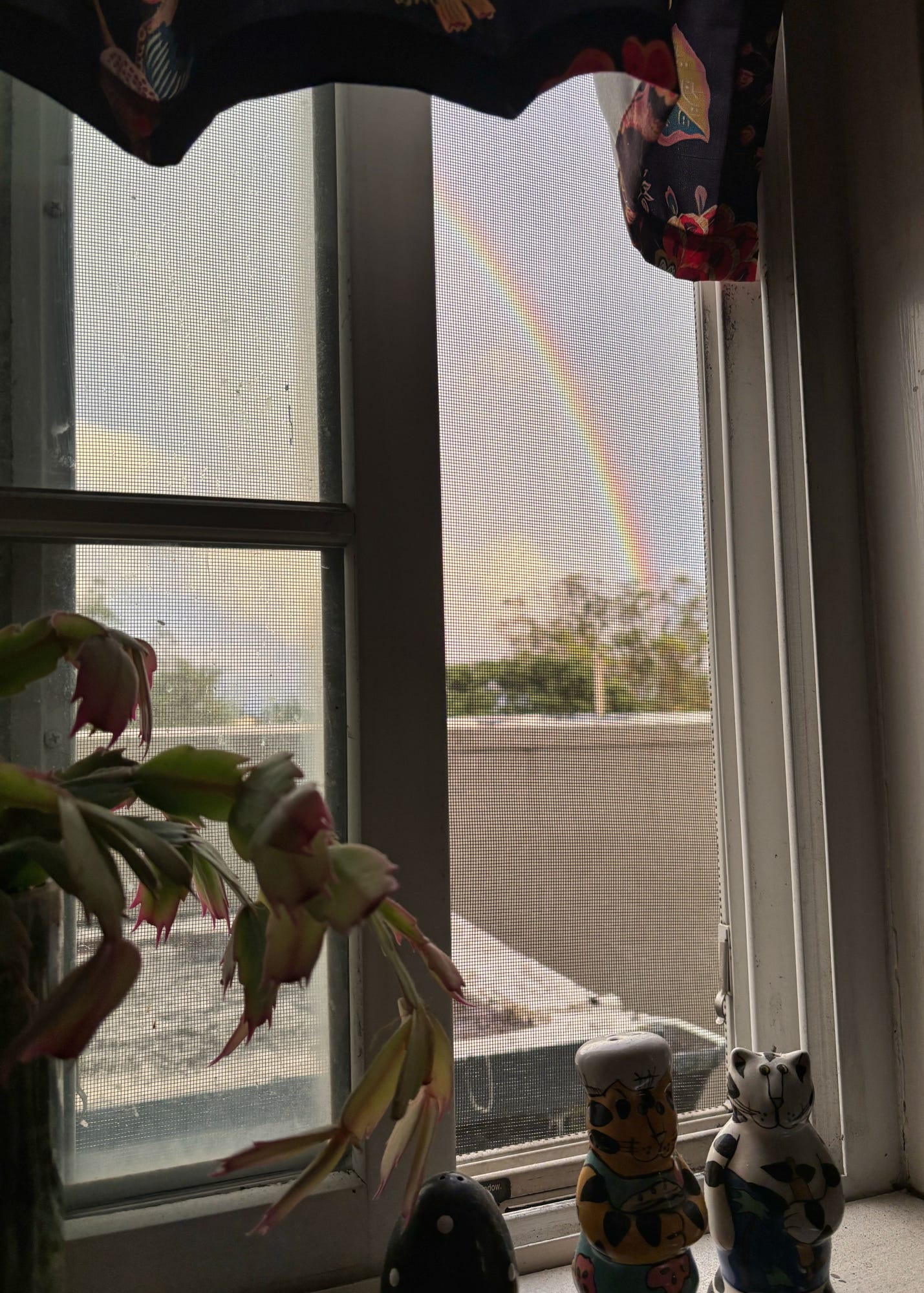 Weird Weather: Anyone who knows me knows how I feel about talking about weather, but there was some kind of deluge this week, more rain in ten minutes than I’ve ever seen. The temperature dropped something like 25 degrees, and the house dropped to 59. (We wear layers and keep the heat at 63 in the dead of winter, so a sudden 59 felt cold.) — Shortly after coming in from the rain, I stumbled into the kitchen to make a late afternoon coffee, and there was a giant rainbow out the window. The windows are dirty, and what you see out the window is the roof of the house next door because of the slope of the hill. It’s not a glamour shot, but the rainbow was beautiful.2