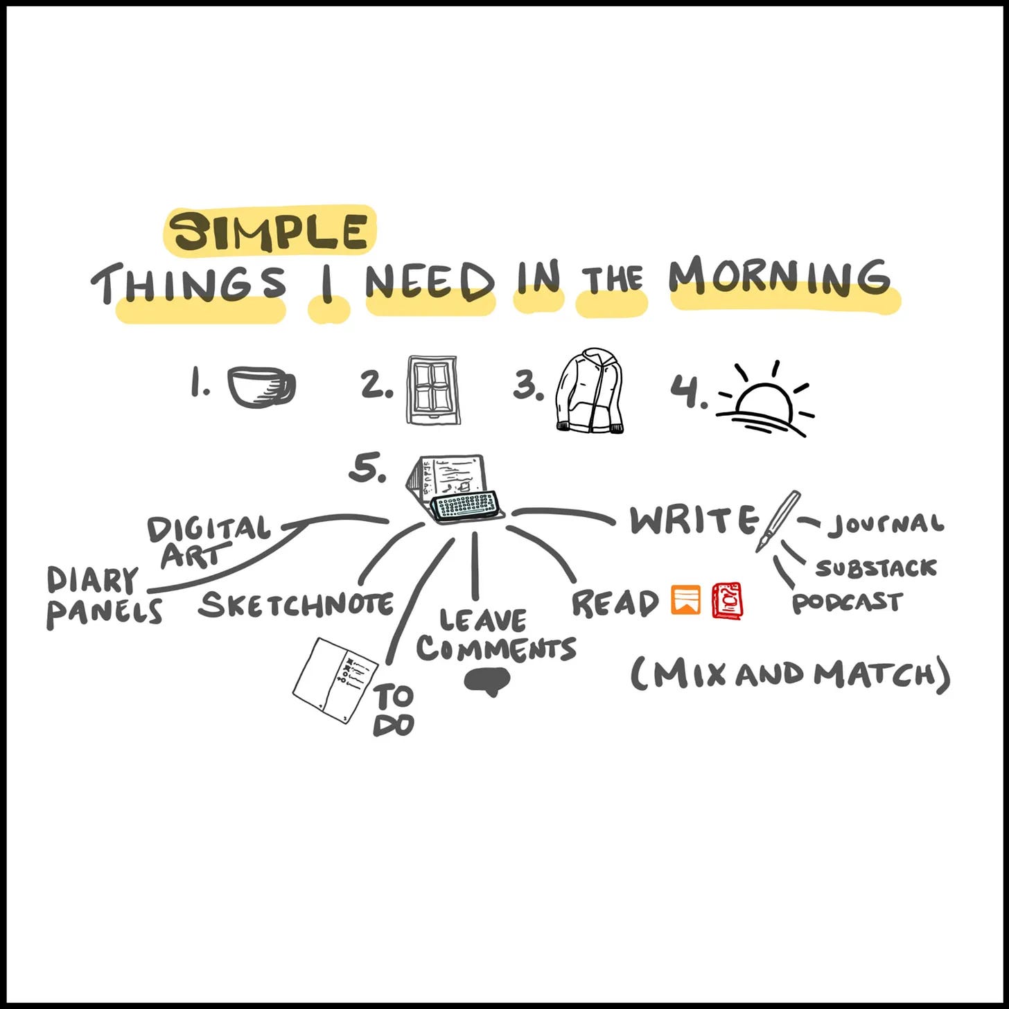 2023: Morning Routines, Screens, and Fifteen Minutes — Yeah. This is a battle I continue to lose. I try to resist scrolling right away, but my current reflection/journaling mechanisms do involve screens. I had fun trying to create illustrations for this post. (Back then, I thought I would get to the point where my weekly posts would be illustrated.)