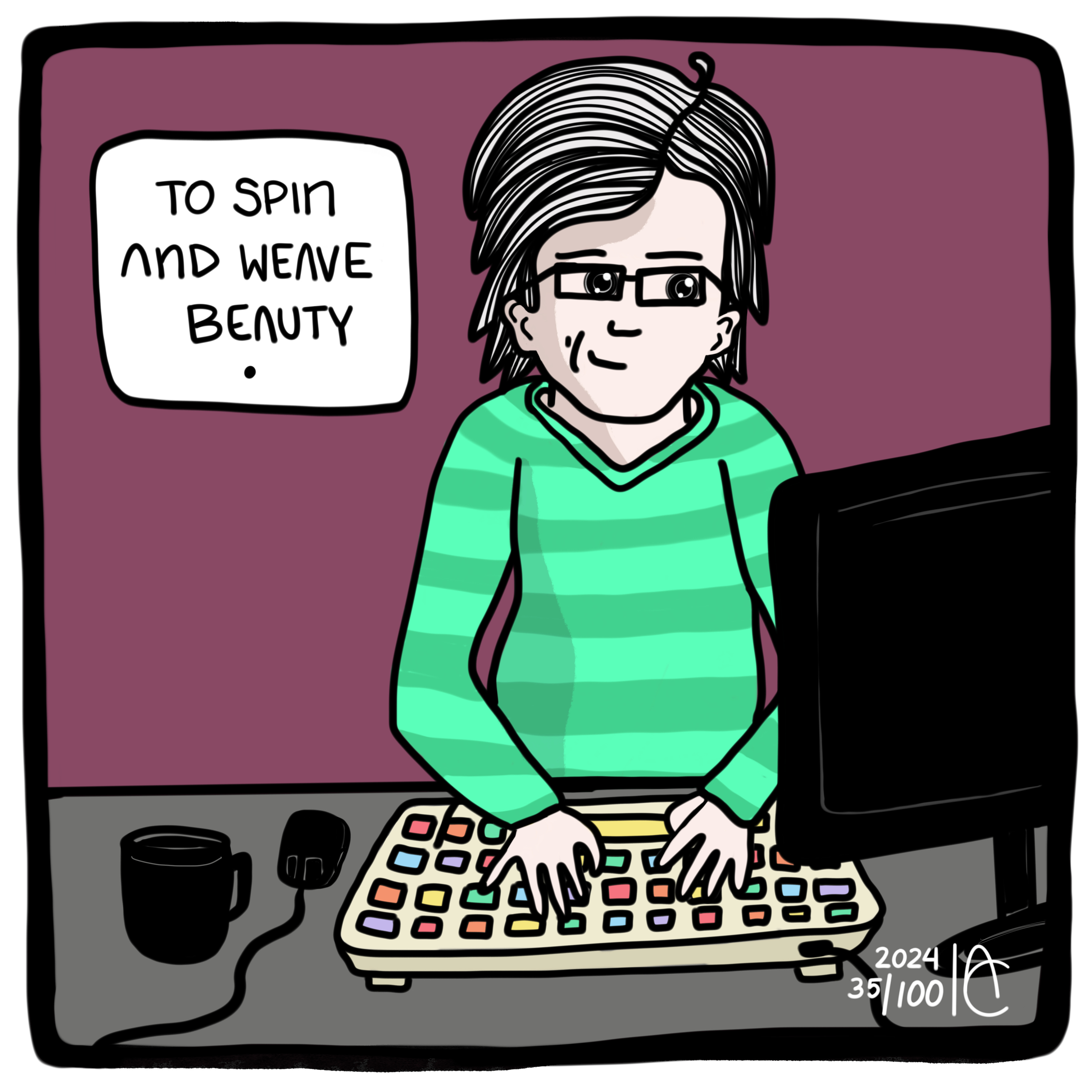 (Thoughts on day 35: a continuation of days 31, 32, 33, and 34. This could go on forever, but this ends the sequence. Again, the sequence is affirmation and metaphor. About the art: this isn’t the “expected” image in that it isn’t something that appears beautiful (so the words and the image give us something different to puzzle out). Initially, I had planned the final panel to be a crane, but then I used the crane early on. I thought about showing something being drawn, but a previous panel has flowers in a sketchbook. Then I realized the obvious, that words (my words) are also part of the “beauty” that fits in this line of thought. So this is a character at a keyboard. It was a challenging scene in some ways (for me), but I’m happy with the result.