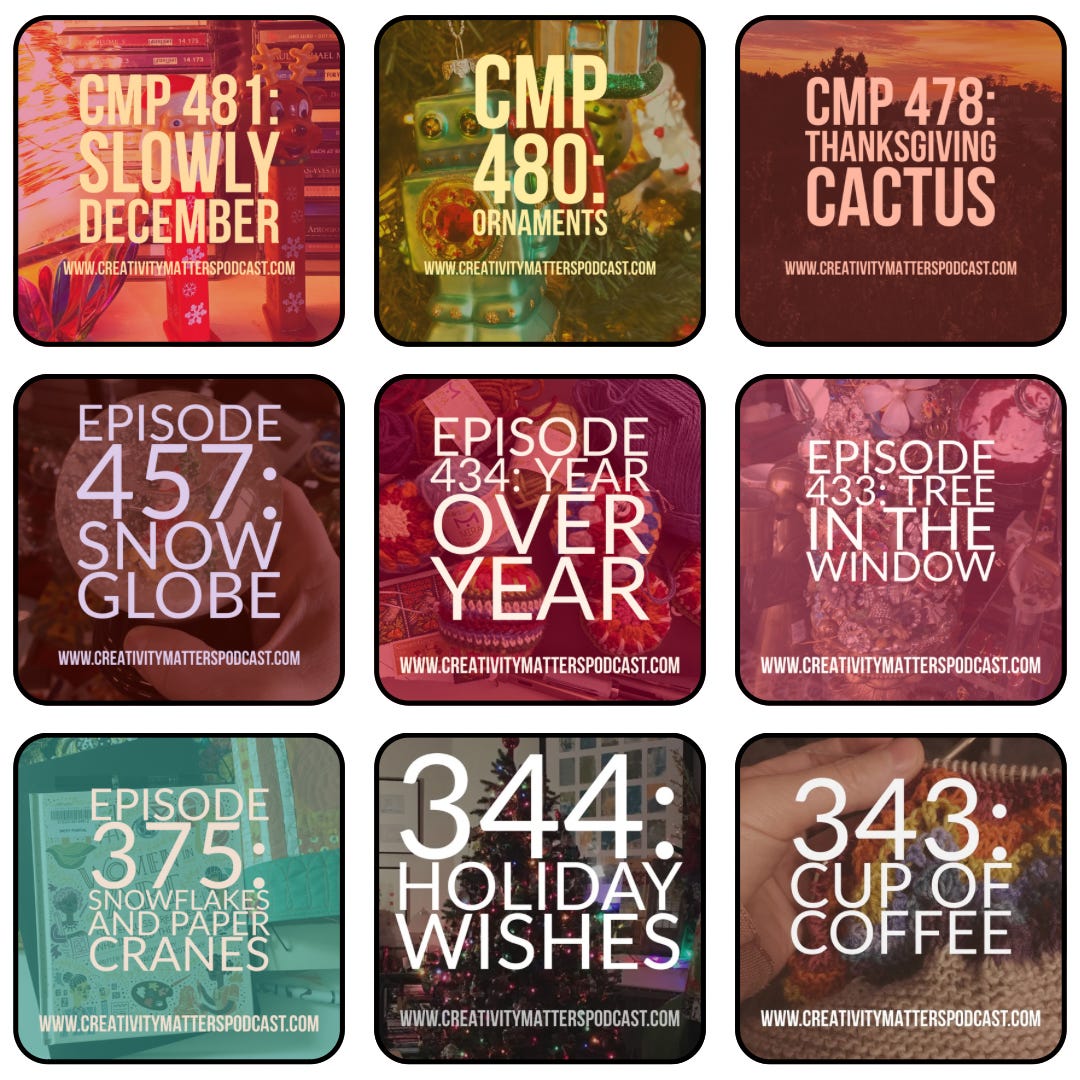 December has always been a favorite month on the Creativity Matters Podcast. I may not remember the words from one year to the next, but I remember the feeling of sitting in a dark room, turning on a string of holiday lights, turning on the mic, and talking into the hush.
