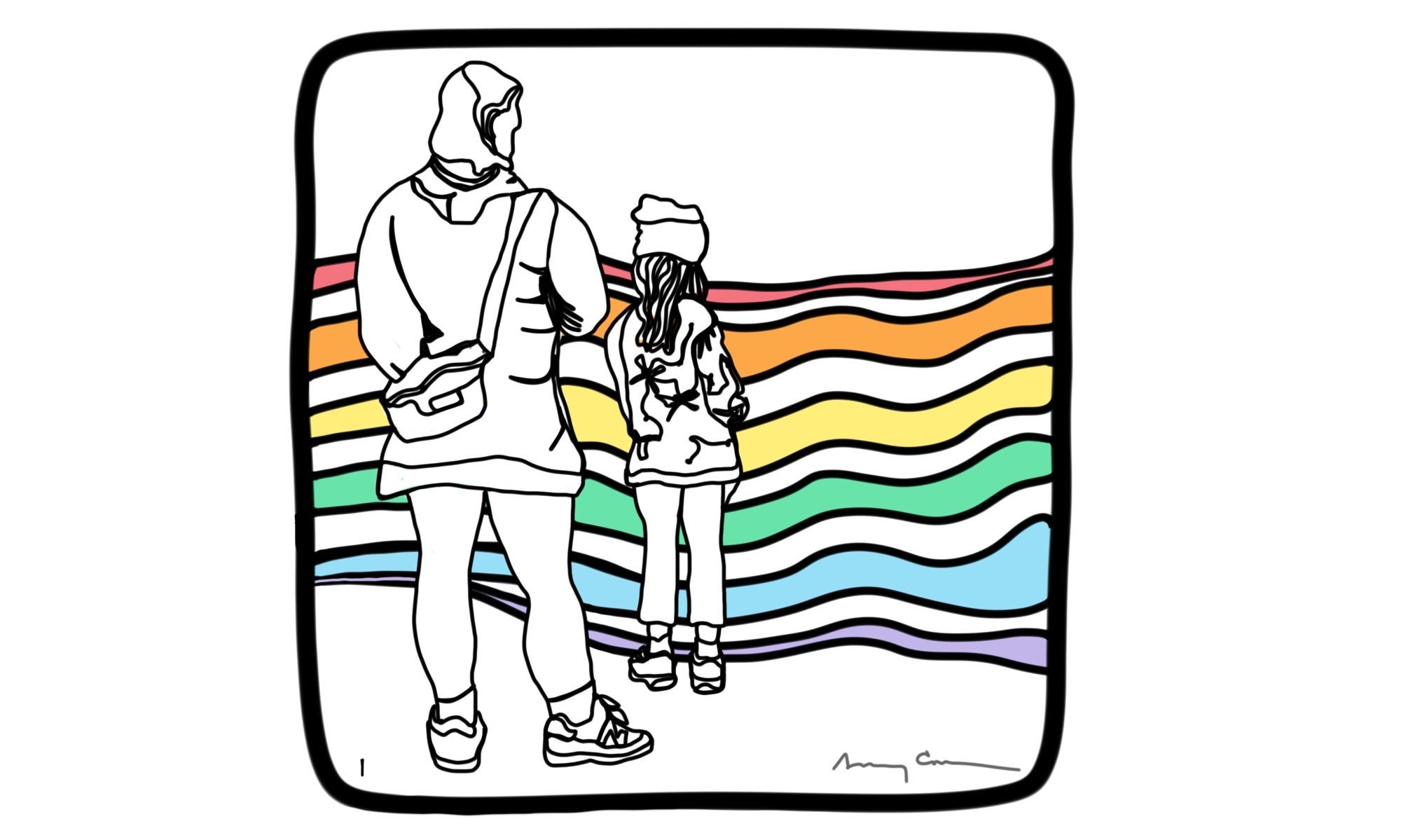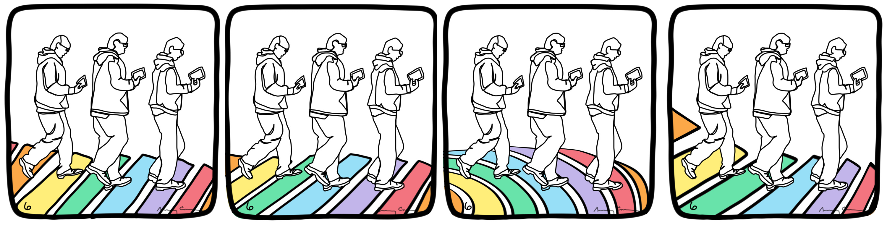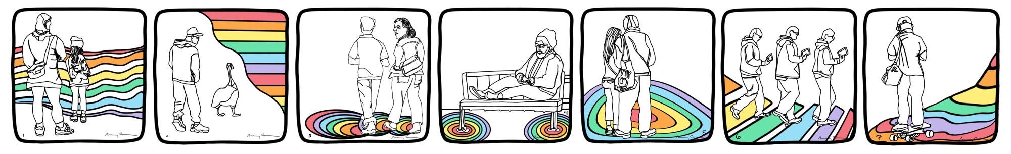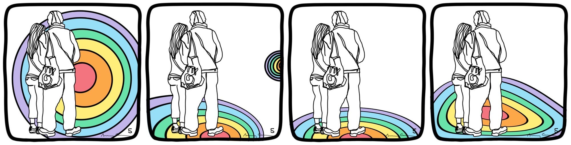 I played with the ground multiple times after finishing the daily panel. I may have tried a number of topographical elements when making the panel. That is part of the process. But once I settled on one and was finished, I found myself going back to study the topography, the shape and elevation, the balance between the rainbow surface and the figures.