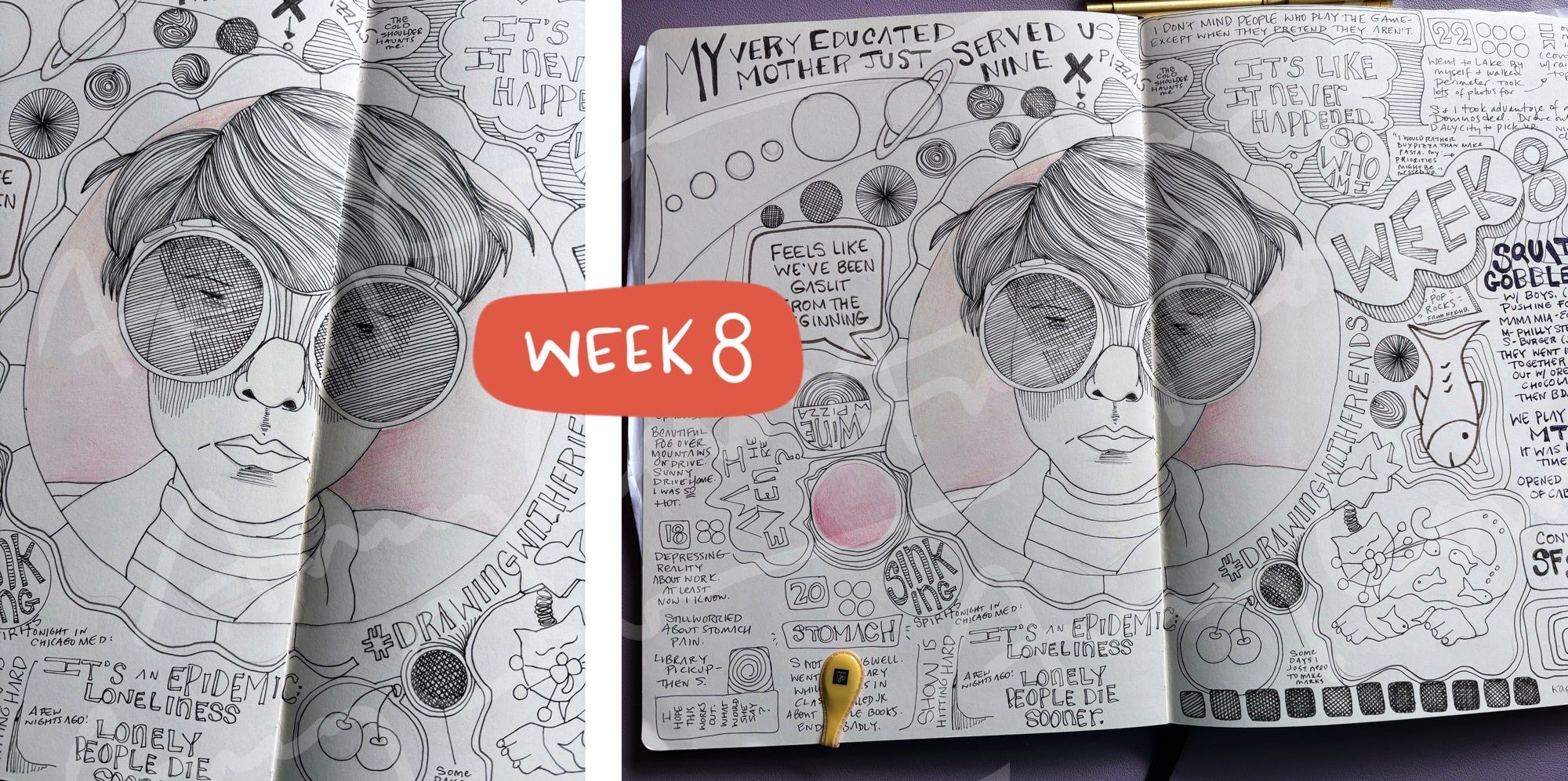Week 8 hinged on a central portrait. During our drawing group, I penciled the portrait and then filled in the framing circle, rather than the hair, with the softest of pinks in colored pencil. It was a random choice, but somehow it set the tone for the whole spread. The week stayed soft and light, mostly monochromatic.