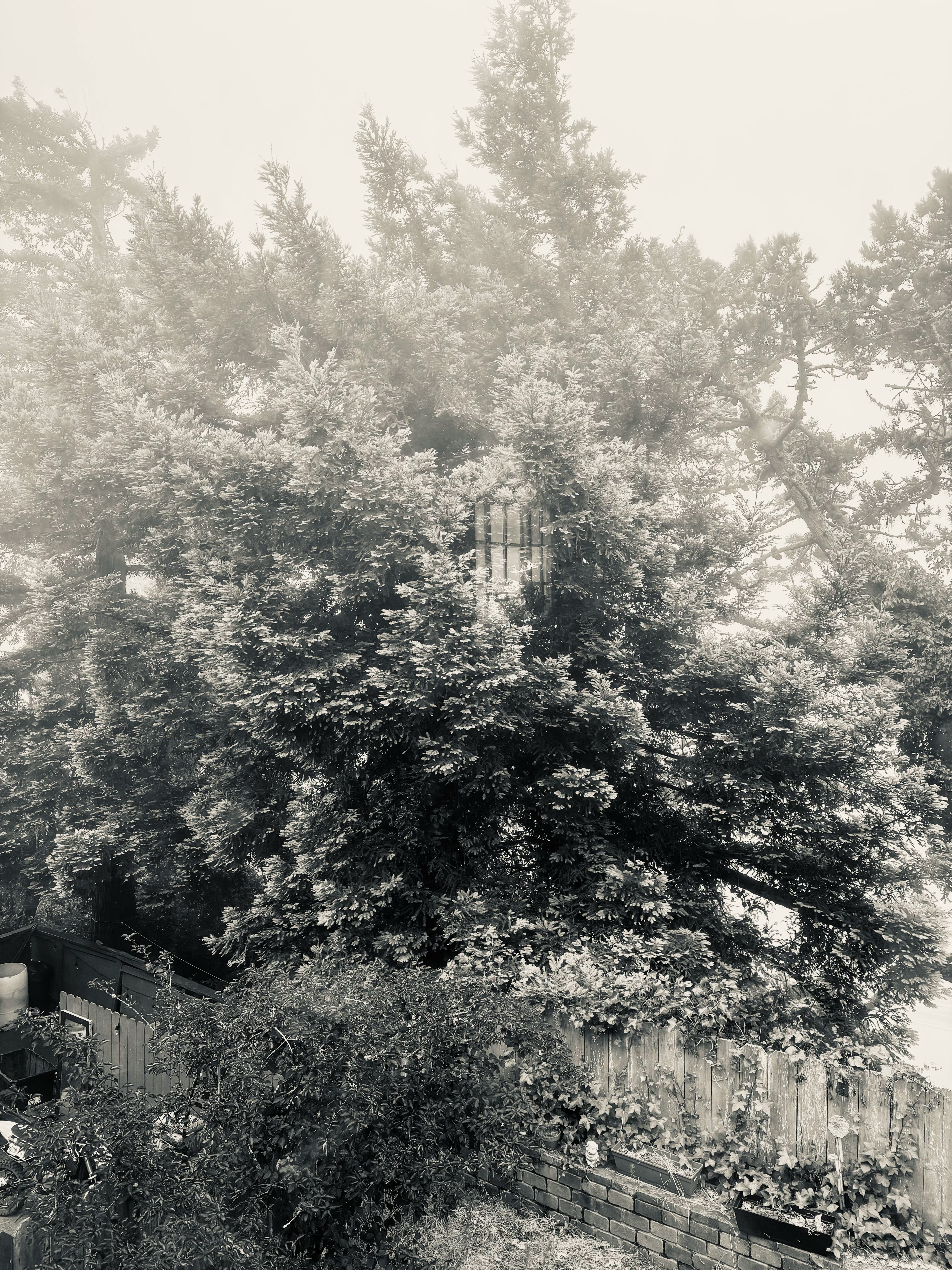 Watching the windblown fog out the back window, I suddenly notice the reflection of the kitchen window. In terms of walls, the kitchen window is on a wall perpendicular to the living room window. The living room curtains are mostly drawn at the edges. I can’t work out how I can see the reflection of the kitchen window at all. I wish I could diagram for you why this seems impossible, but yes, yes, angle of incidence and all that. I don’t need to solve for x.