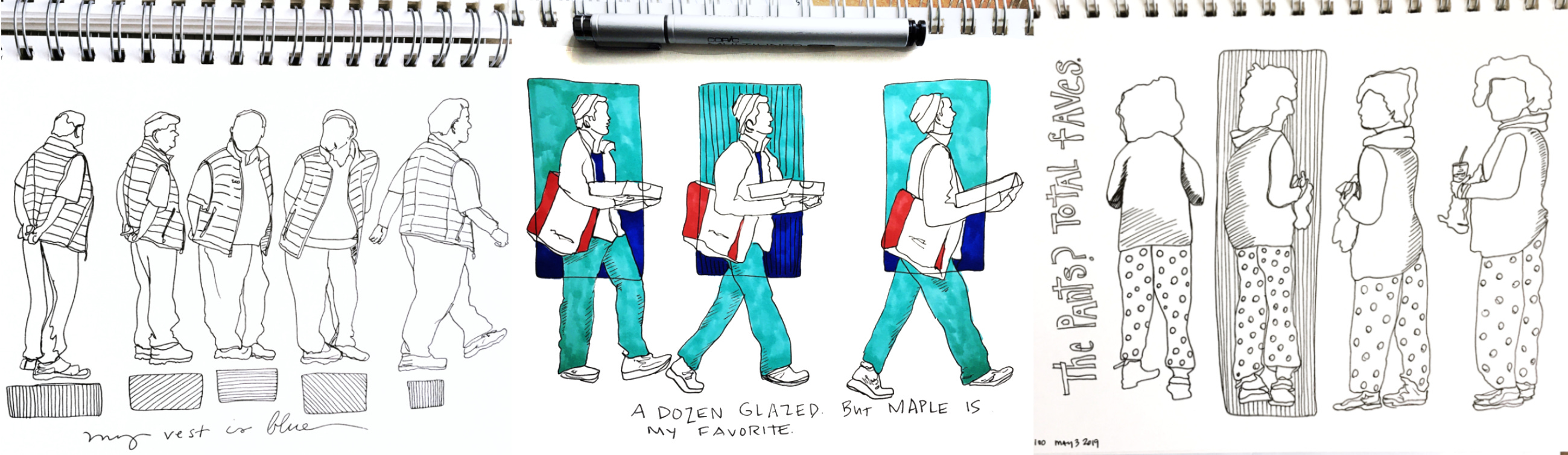 Several years ago (2019), I drew contours of people in motion. I snapped photos in series and then did contour drawings capturing the slight movements as people shift in time and space. I referred to it as Slices of Life. It remains a favorite project.4 (I have a lot of favorite projects.)