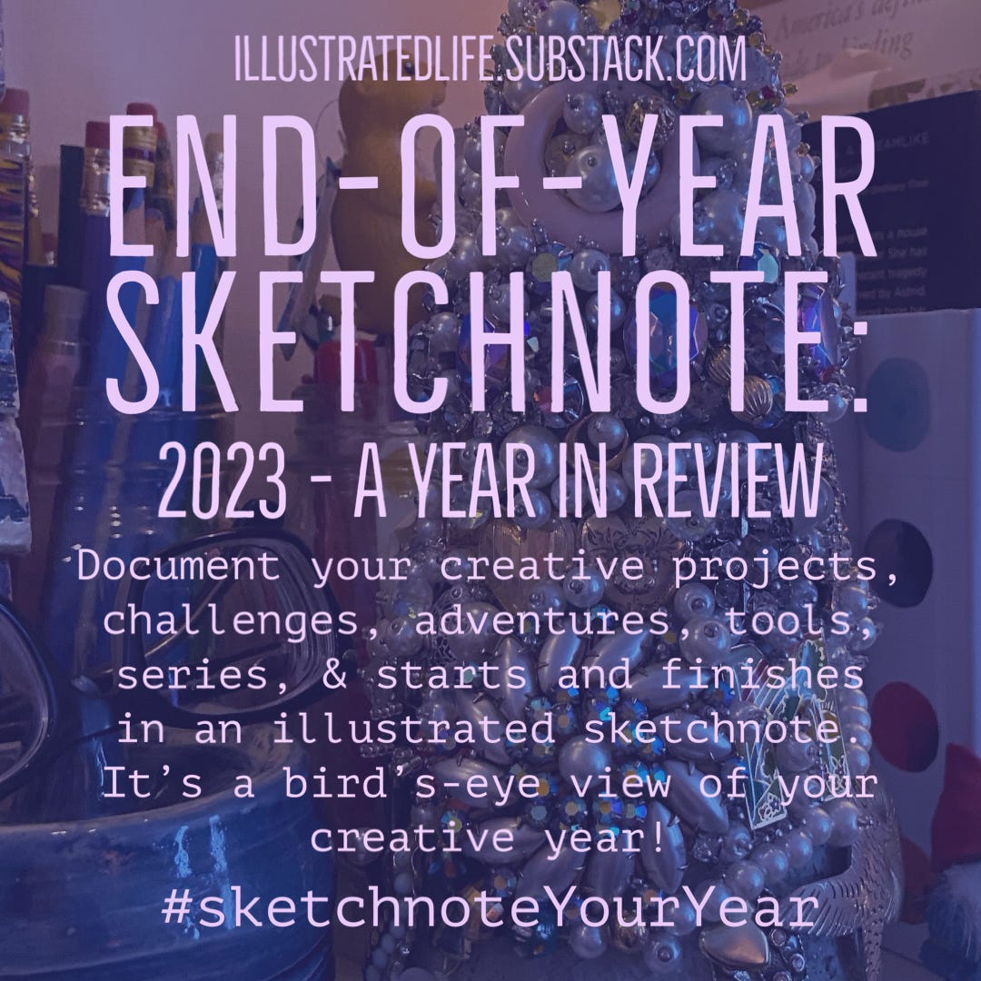 This week always goes more quickly than I anticipate, a combination of family, reality, and juggling some work hours and not enough time off. I always hope to fit in year-end reflection questions, 2024 creative life planning questions (coming soon), word of the year (WOTY) thinking, and my year-end sketchnote as the year winds down.