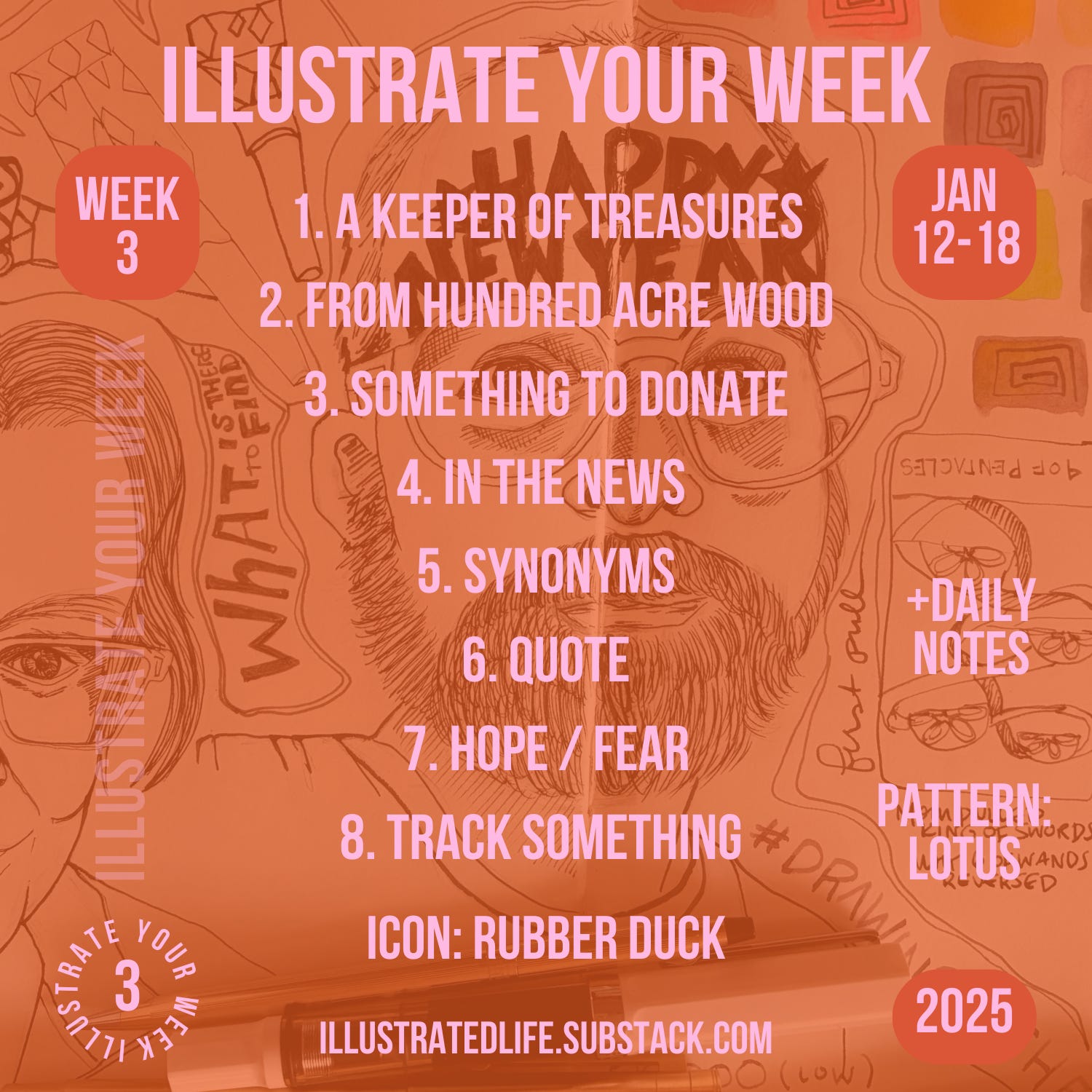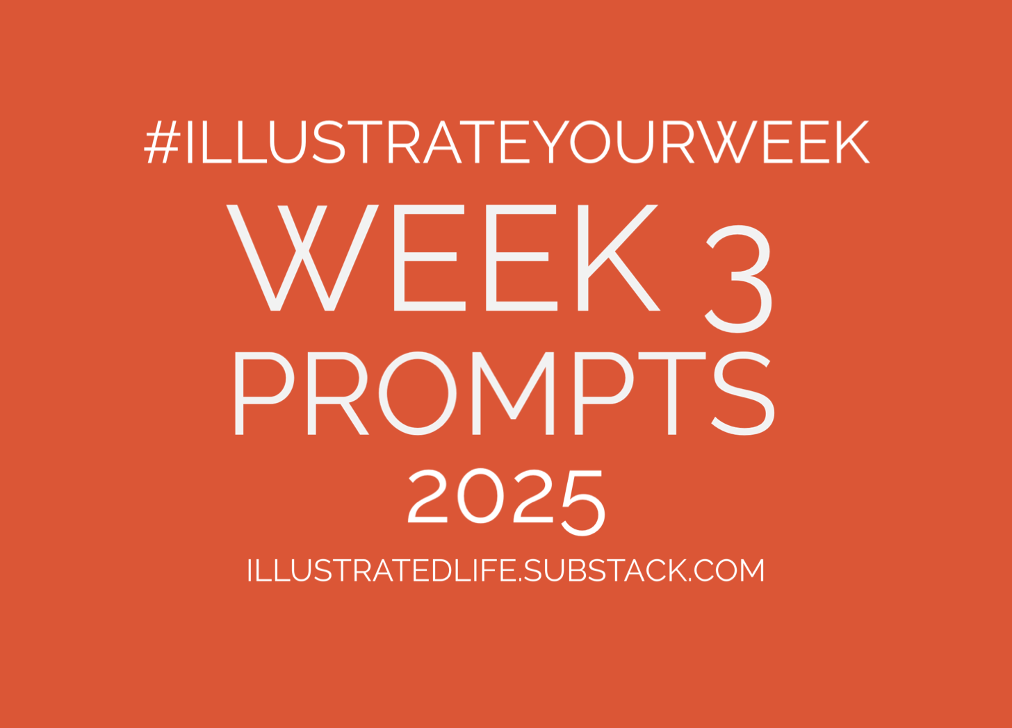 Week 3 for 2025. There is a lot going on in the world right now. I am not sure any of us need prompts that take away from the reality of the world. Go with what is true for you. The prompts are just suggestions. They offer a rubric and a ready-made set of things that you can draw or think about or document. They are here if you need additional nudges or ideas or suggestions that just let you focus on what is right in front of you or let you tune out reality for a bit.
