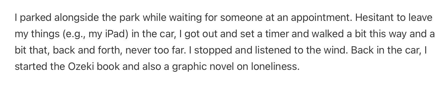 Knowing that there had been a comment that named "the book" the week I obliquely mentioned it, I finally tracked down the post, the week, the spot in the timeline. That I could find nothing in my files to pinpoint the week was frustrating. This is the whole point of constructing a better system. My oblique reference, sans title, meant that a mention buried in a draft might be just one of dozens of hits in my files for loneliness.